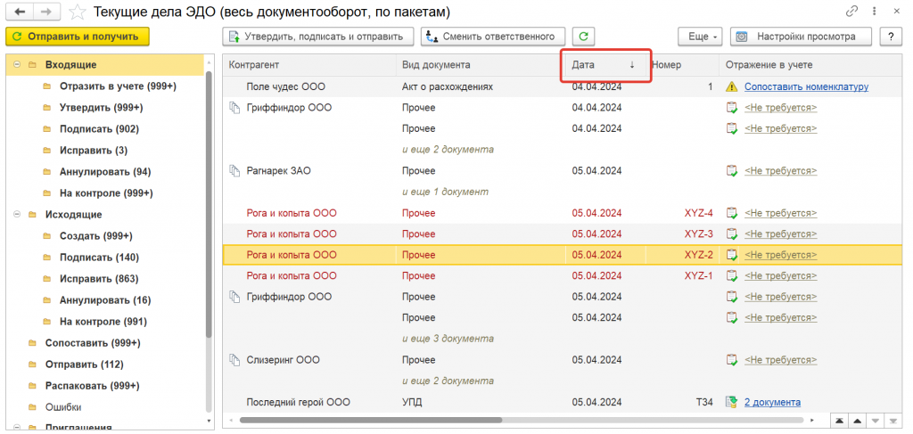 • Основная выборка: Данные загружаются из таблицы документа «Электронный документ входящий ЭДО».