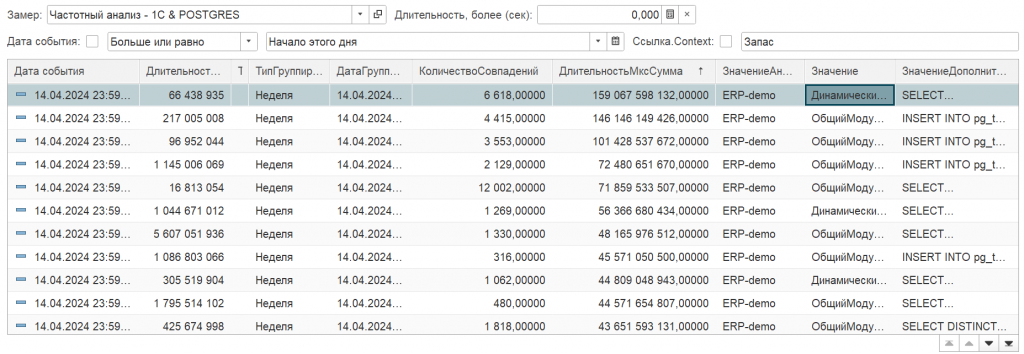 Рис. 1. События замера -  Частотный анализ - 1C & POSTGRES