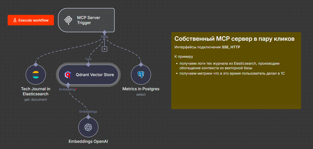 В данном примере мы обращаемся к Elasticsearch, получаем технологический журнал, идем в векторную базу Qdrant, чтобы обогатить события из журнала метаданными, и подключаемся к Postgres, откуда получаем метрики работы оборудования и пользователей. После этого вся собранная информация передается обратно модели.