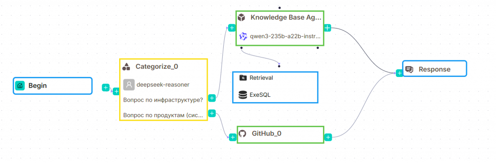 Это корпоративный инструментарий, который можно развернуть с помощью Docker. В нем можно гибко и точно настраивать правила роутинга и выборки знаний.