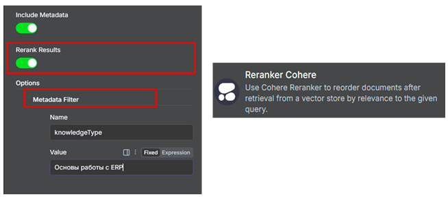 RAG – технология новая, но не лишенная недостатков. Выборку из векторного хранилища можно значительно улучшить, если включить одну галочку, которая есть у любой ноды векторного хранилища: использование кросс-энкодинга, или так называемого Reranking.