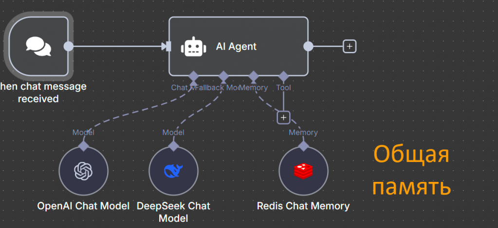 Если в дополнение использовать ноду памяти, переключение между моделями будет полностью бесшовным – диалог продолжится с того же места, и пользователь не заметит перехода.