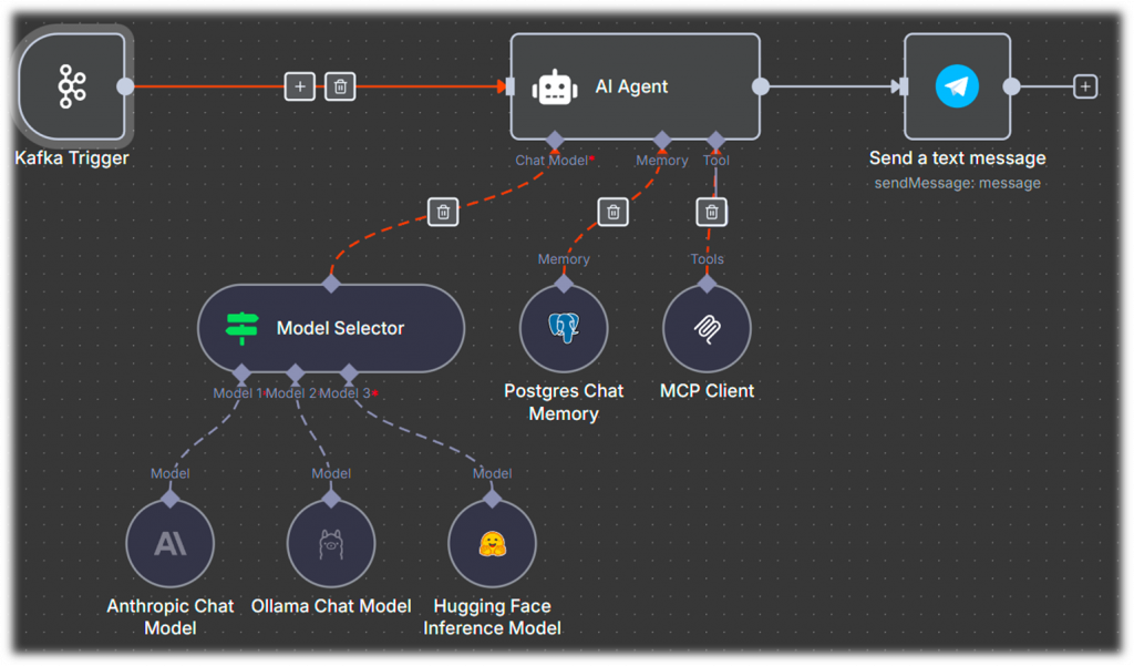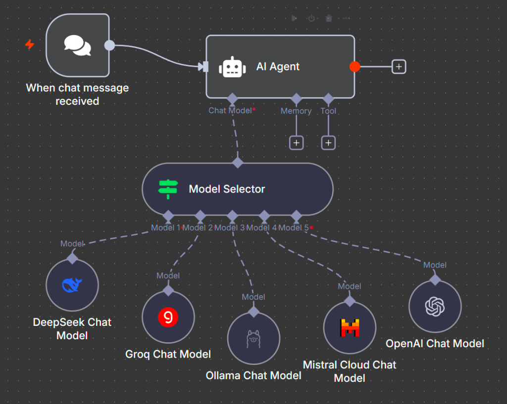 Мультимодельность – еще одна интересная фича n8n. Агенту можно подключить ноду Model Selector и выбрать от двух до десяти моделей. В промпте указывается, для каких кейсов используется каждая модель. Например, для задач по кодингу – Grok, для обработки больших текстов – локальные модели, чтобы не обращаться во внешний мир, а для обычного общения можно подключить DeepSeek.