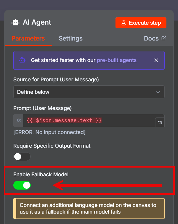 Второй лайфхак – использование резервной модели. Меня не раз выручала галочка Enable Fallback Model, доступная в любом агенте n8n.