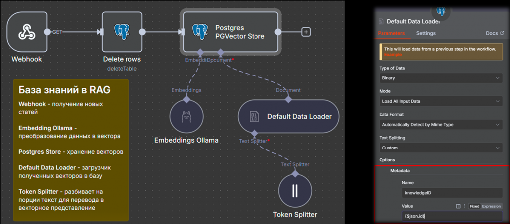 Далее он вызывает рабочий процесс n8n, который начинается с Webhook. Webhook превращает рабочий процесс в HTTP-публикацию, если говорить на языке 1С – это HTTP-сервис, принимающий данные на вход извне. Сервис отправляет информацию о новых или измененных статьях на Webhook. Далее текст разбивается на порции и преобразуется в математическое векторное представление – так называемый эмбеддинг.