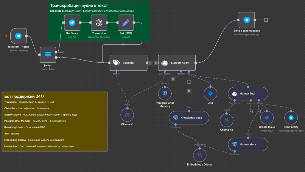 В tools подключена нода Human Tool, которая делает следующее: агент создает Jira issue, идет в векторную базу, смотрит по классификации, кого из сотрудников можно назначить на задачу, описывает ее вместе с полученными из базы знаний ответами, формирует issue и отправляет ответственному сотруднику, затем передает управление обратно в ключевую ноду агента. Агент собирает полную картину с назначенным сотрудником, ответом и номером задачи и отправляет сообщение пользователю. В результате получается агент поддержки, который способен разгрузить работу сотрудников поддержки.