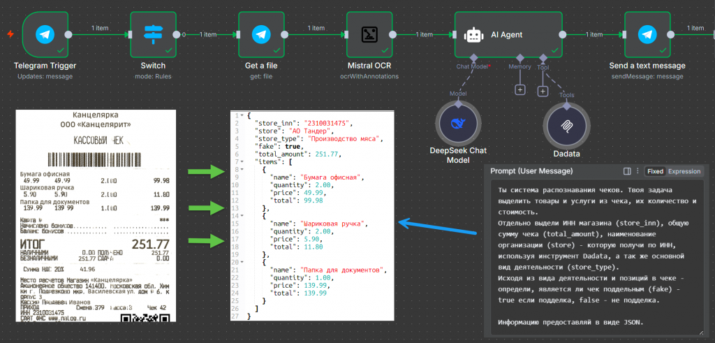 Мы передаем данные в Dadata и в промпте указываем, что хотим получить вид деятельности и наименование клиента. Затем сверяем полученные сведения с тем, что указано в чеке. Например, у организации вид деятельности – мясоразделка и свиноводство, а в чеке указана покупка карандашей. При этом наименование организации в чеке не совпадает с тем, что возвращает Dadata. Модель определяет, что чек не является настоящим.