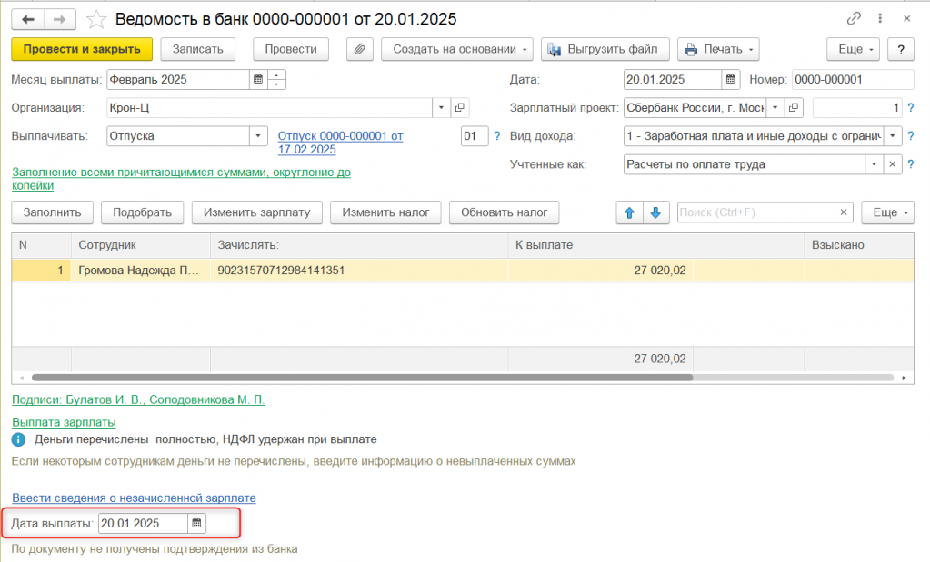 При этом в документах, таких как «Ведомость в банк», «Ведомость в кассу», «Ведомость через раздатчика» и «Ведомость на счета», фактическая дата получения дохода уточняется автоматически в поле «Дата выплаты», расположенном в нижней части документа. Это поле предназначено для случаев, когда фактическая дата выплаты отличается от ранее запланированной в документе начисления. Такой подход позволяет избежать необходимости возвращаться в документ начисления для уточнения даты выплаты, что экономит время и снижает риск ошибок.