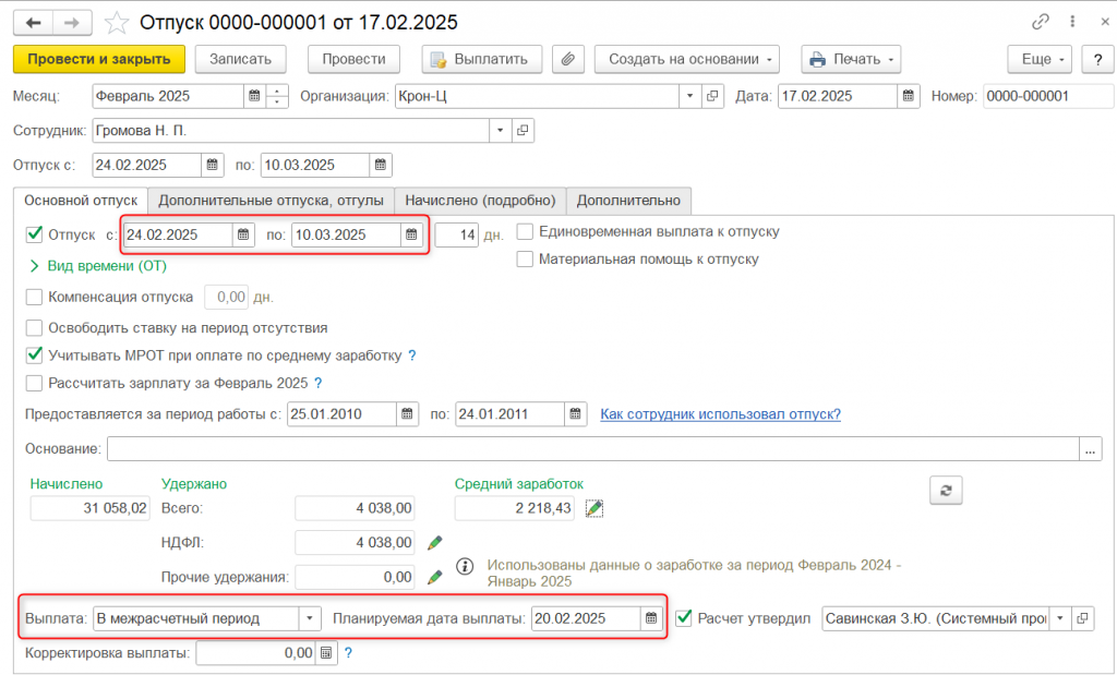 Чтобы лучше понять, как это работает, рассмотрим пример с расчетом отпускных. Предположим, сотрудник планирует взять отпуск с 24 февраля 2025 года по 10 марта 2025 года.