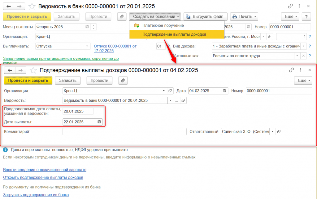 Однако иногда может случиться так, что реальная дата выплаты средств по ведомости отличается как от указанной в самой ведомости, так и от запланированной даты. Если в такой ситуации изменить дату в ведомости уже невозможно, то можно воспользоваться документом под названием «Подтверждение выплаты доходов». Этот документ можно создать на основании ведомости, что делает процесс коррекции данных более удобным. В документе «Подтверждение выплаты доходов» для выбранной ведомости можно указать реальную дату, на которую были произведены выплаты. Эта дата станет официальной датой получения соответствующего дохода.