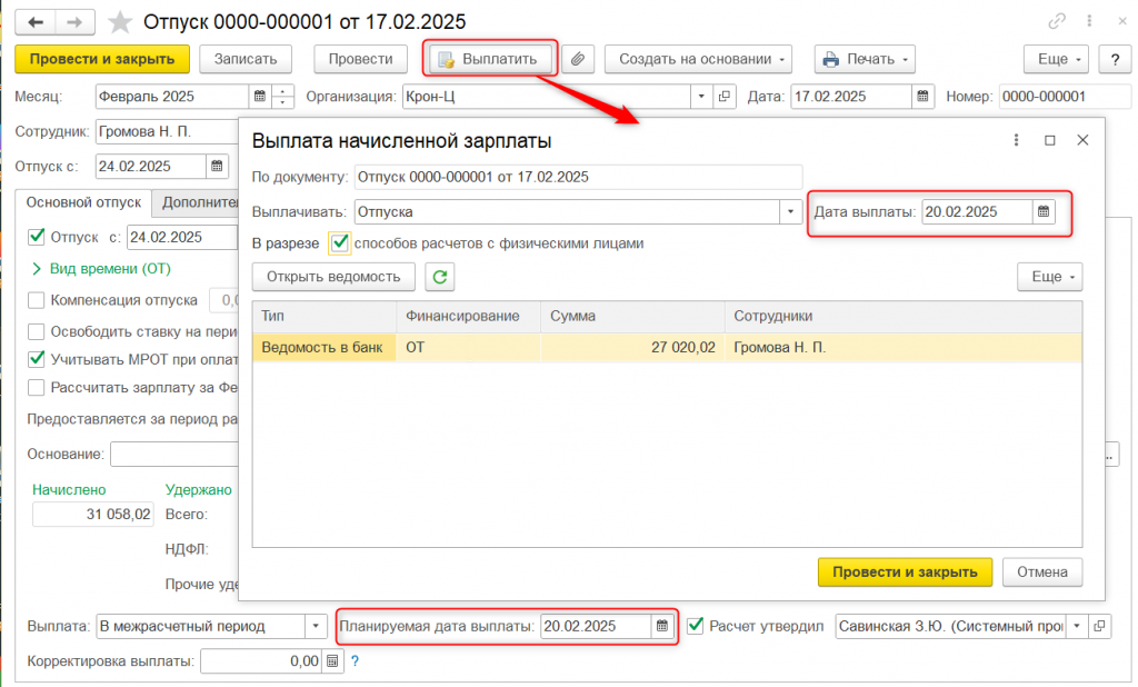 В документе, который оформляется для учета отпускных, под названием «Отпуск», поле «Планируемая дата выплаты» автоматически заполняется датой, которая на три дня меньше даты начала отпуска, то есть 20 февраля 2025 года. Это делается для того, чтобы обеспечить своевременную выплату средств перед началом отпуска.