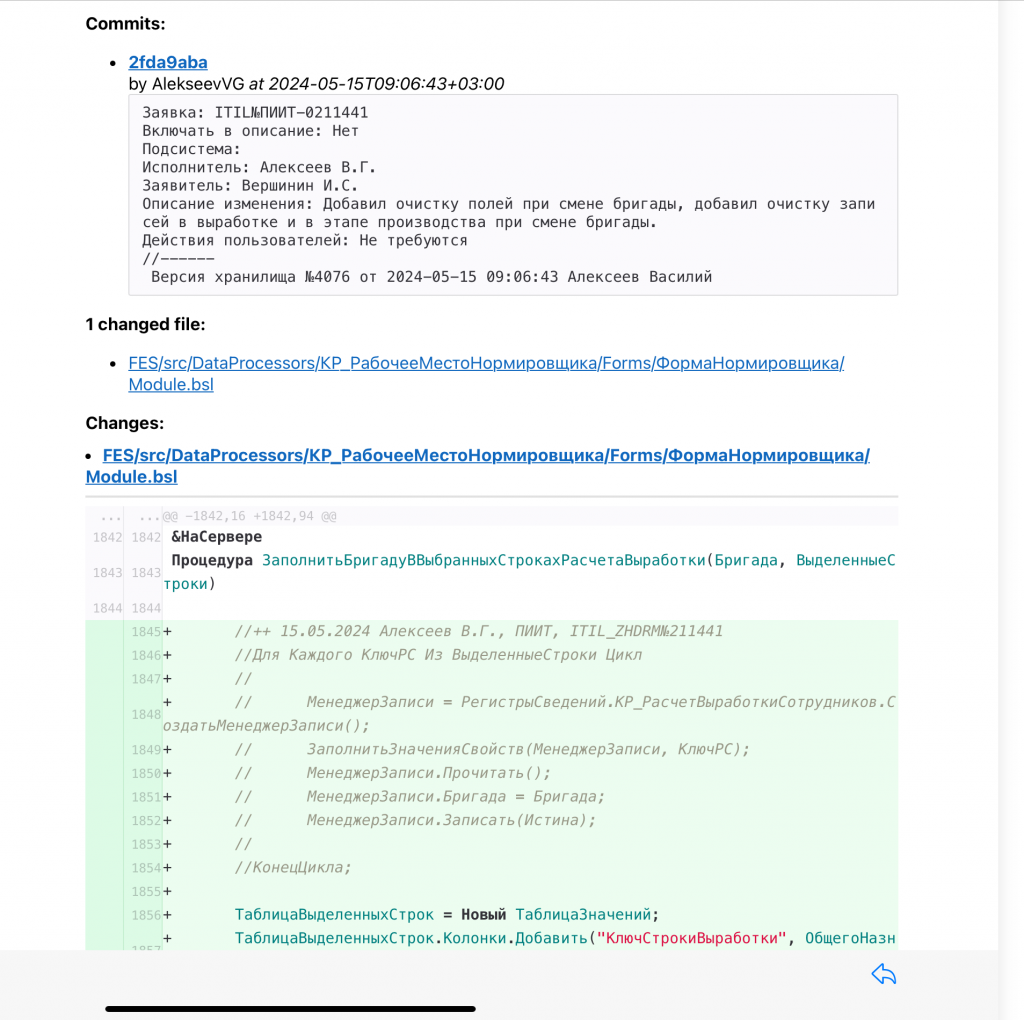 А так – обратная связь архитектора к разработчику: комментарии, видны участки измененного кода и обсуждение.