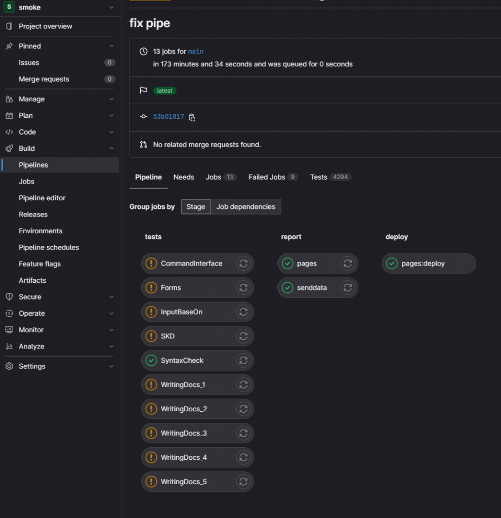 Для автоматизации с помощью GitLab мы используем пайплайн CI/CD – инструментарий, который позволяет запускать разные типы тестов отдельно друг от друга, в зависимости от их назначения. Например, отдельно запускаются дымовые тесты проверки форм, отдельно – репорт-задачи, собирающие отчеты и передающие данные в Telegram и другие системы.