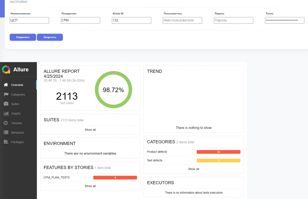 Если открыть карточку проекта, можно увидеть настройки доступа к пайплайну и отчет Allure, который показывает общую успешность прохождения тестов – например, 98%.