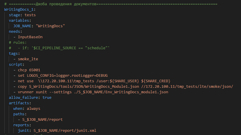 Вот так выглядит скрипт для запуска дымового теста. В данном случае – это проведение документов. Мы используем стандартный язык GitLab, но на этом участке видим скрипты из командной строки. Эти скрипты говорят нам о том, что на текущий момент мы используем виртуальные машины на Windows. Для каждого проекта выделена своя виртуальная машина, на которой запускаются 1С, тест-менеджер, тест-клиент и выполняются тесты. После завершения теста виртуальная машина закрывается и ожидает следующего шага – следующего теста.