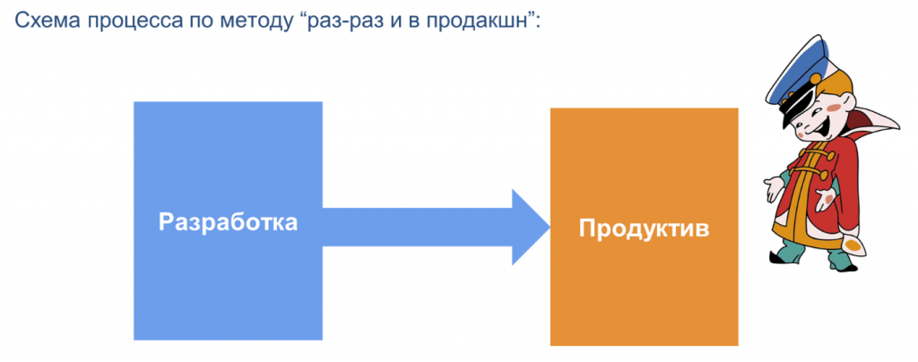 Что в этом подходе должно настораживать? Ручное управление и хаотичность процессов, когда разработчики беспорядочно выкладывают изменения в продуктив, и спустя несколько итераций становится непонятно, что осталось от исходного продукта.