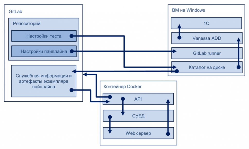 Наш продукт работает примерно так. У нас есть репозиторий на GitLab, виртуальные машины на Windows и контейнеры Docker.