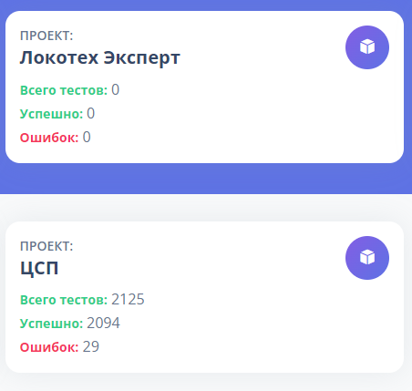 На дашборде отображаются карточки проектов. Например, у нового проекта статистика пока по нулям, а у уже действующего видно, сколько тестов прошло, сколько из них успешных и сколько завершились ошибками. Это позволяет быстро выявить проблемные базы и начать работу с ними в первую очередь.