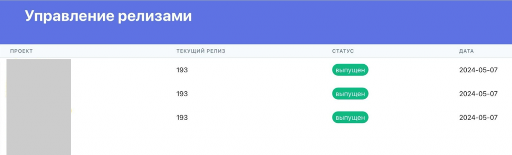 Для начала мы автоматизировали процесс создания релиза и разработали дашборд, где отображаются проекты, номер текущего релиза (наша внутренняя версия), статус и дата выпуска.