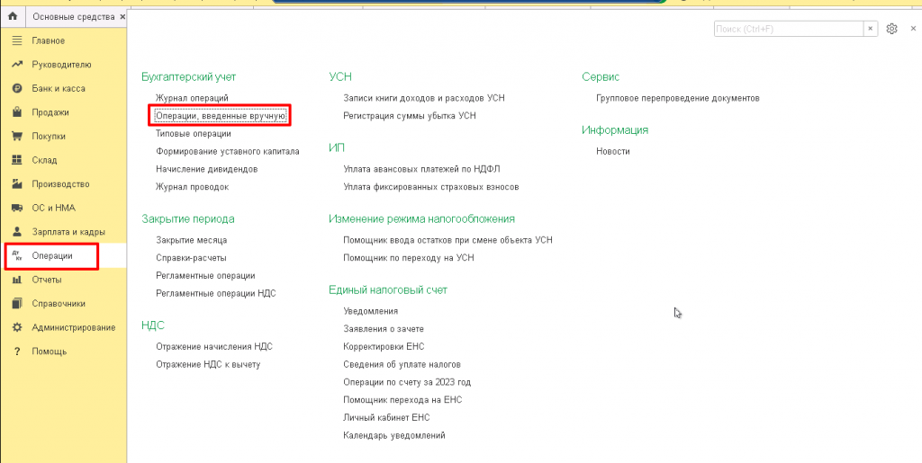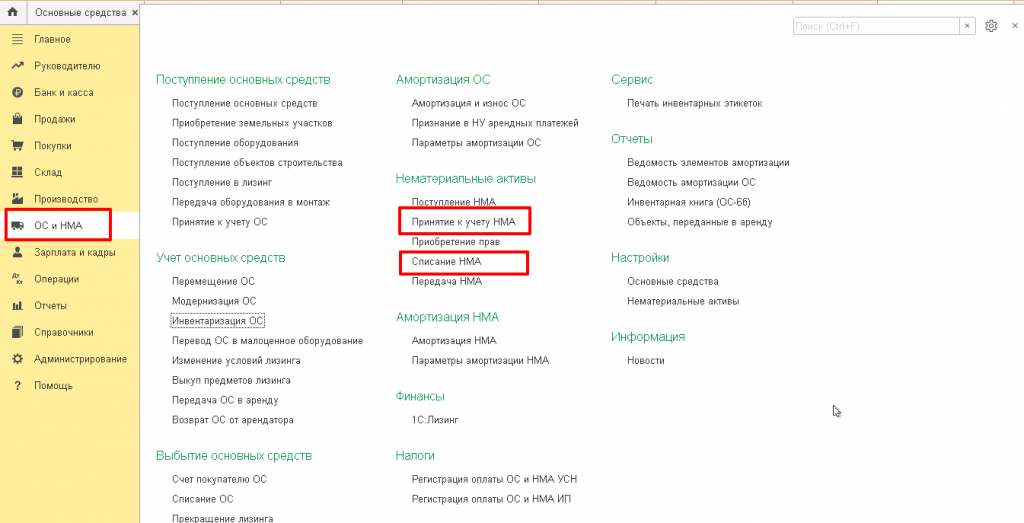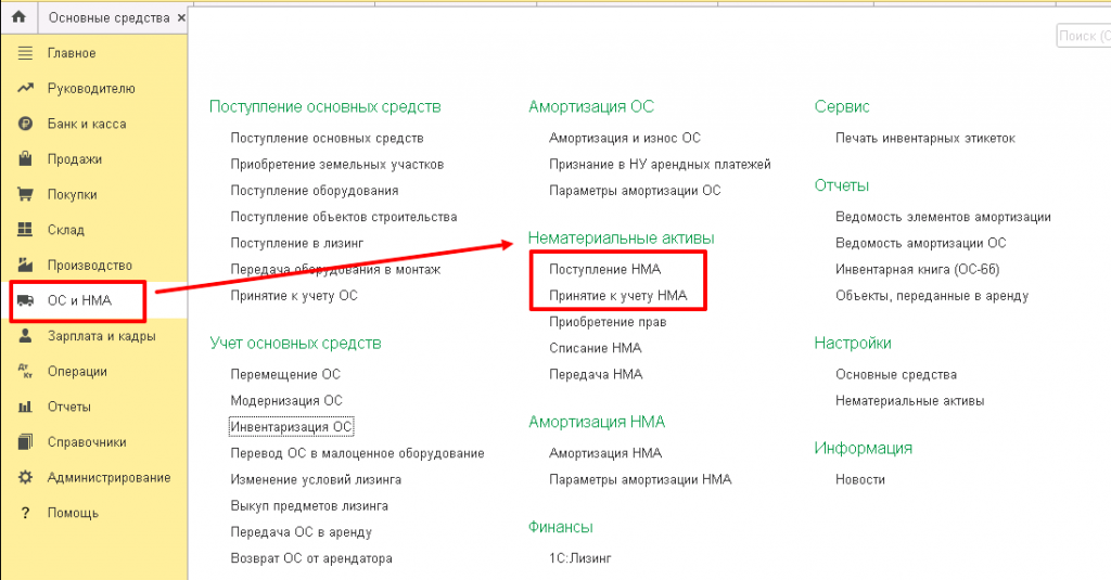 Обработка данных: Перейдите в журналы Поступление НМА и Принятие к учету НМА →. Инвентаризация НМА: Стандартный документ отсутствует, однако можно создать аналог в режиме Конфигуратор.