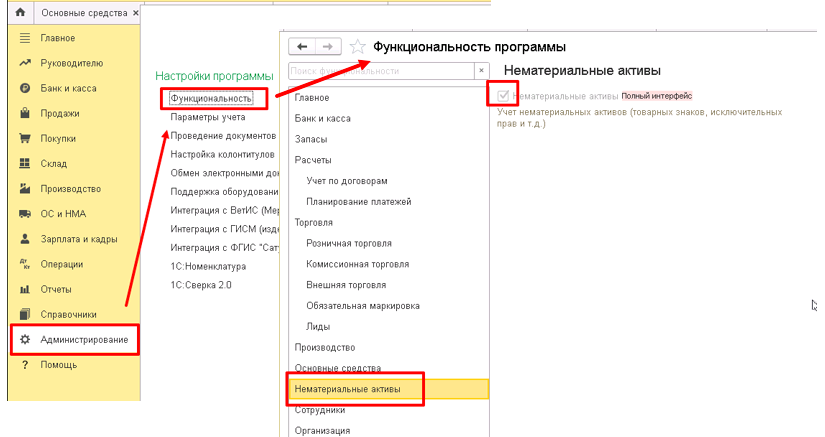 Настройки: Активируйте учет НМА, перейдя в Главное → Функциональность программы и отметив опцию Нематериальные активы.