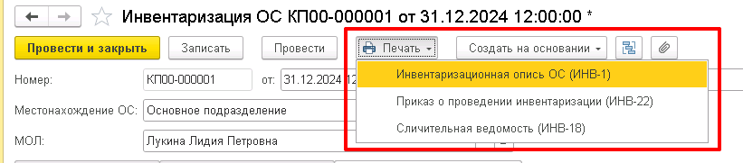 2. Составление описей: Комиссия создает и распечатывает опись ИНВ-1, куда вносит сведения о фактическом наличии объектов в организации.