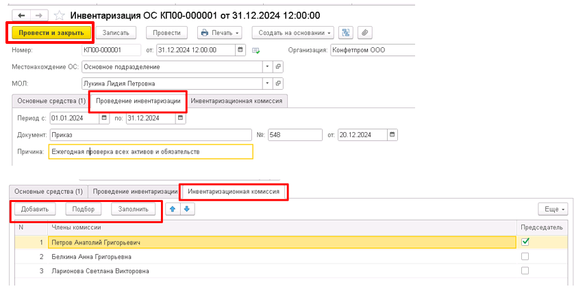 На вкладке Проведение инвентаризации укажите период и основание проверки. Добавьте список членов комиссии, указав председателя. После заполнения всех данных нажмите Провести и закрыть (рис.4).