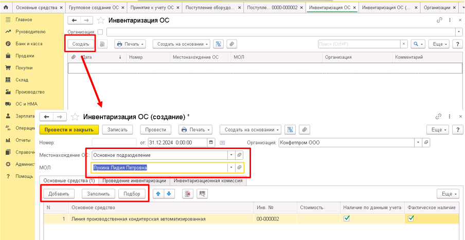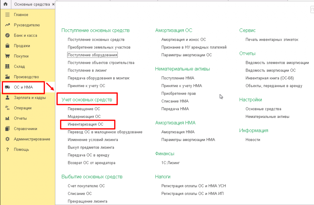 Перейдите в раздел ОС и НМА и выберите Учет основных средств, затем Инвентаризация ОС.