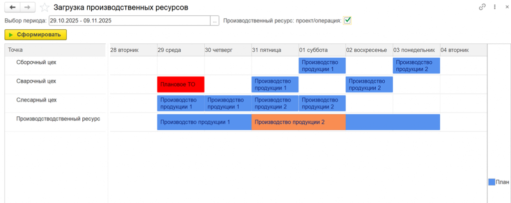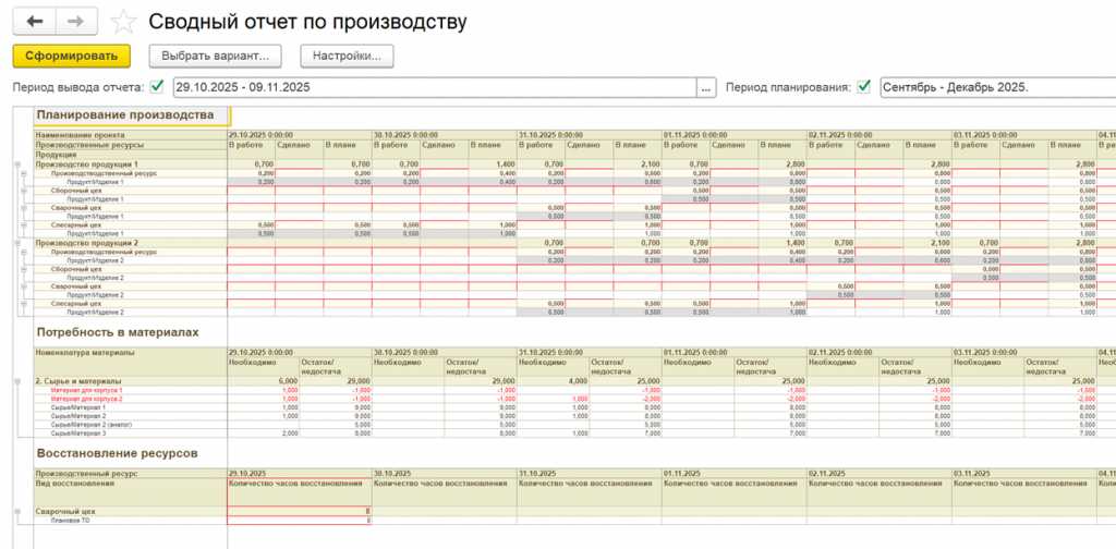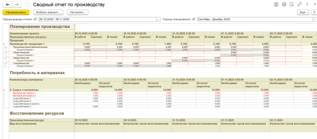 Если параллельно идет производство нескольких изделий, то информацию можно получить и в разрезе проектов производства. При это сводно видна информация по необходимым материалам и запланированным видам восстановления производственных ресурсов.
