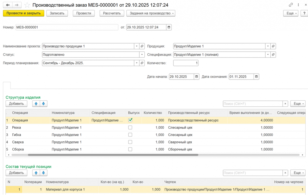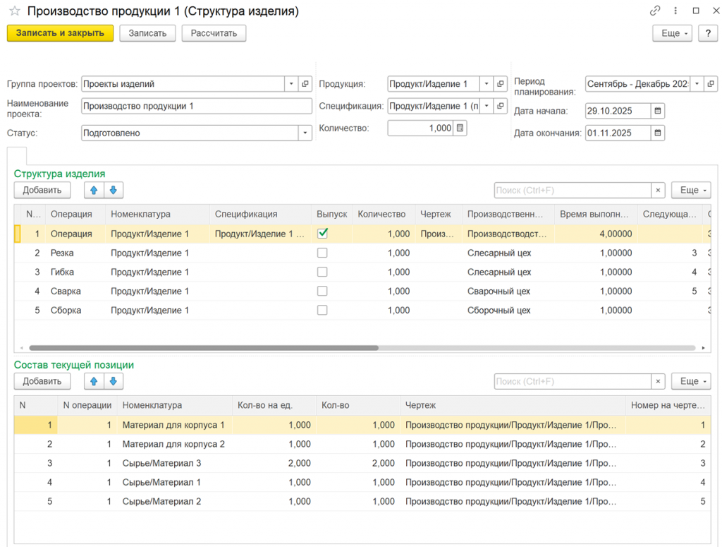 1. Создание первой операции. В справочнике "Структура изделия" создаётся начальная операция "Производство продукции", содержащая общую спецификацию материалов и срок выполнения, например, 4 дня. Для этой операции устанавливается флаг "Выпуск".
