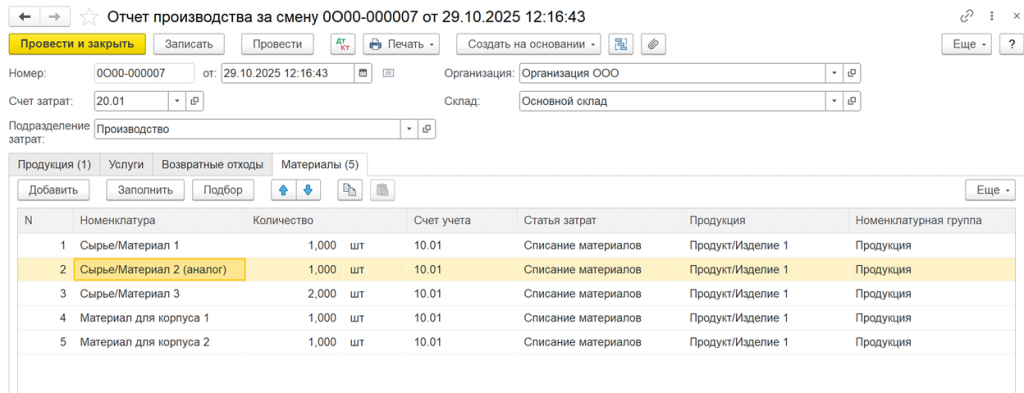 Материалы можно вывести в разрезе заказов, которые запланированы, а также с учетом аналогов, которые не привязаны к конкретным проектам и доступны всем проектам производства.