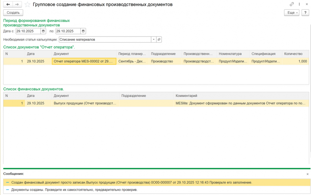 5. Финансовые итоги. Финансовое оформление выпуска осуществляется по общей спецификации, зафиксированной в общей производственной операции. Таким образом, финансовые показатели не зависят от детализации отдельных этапов производства.