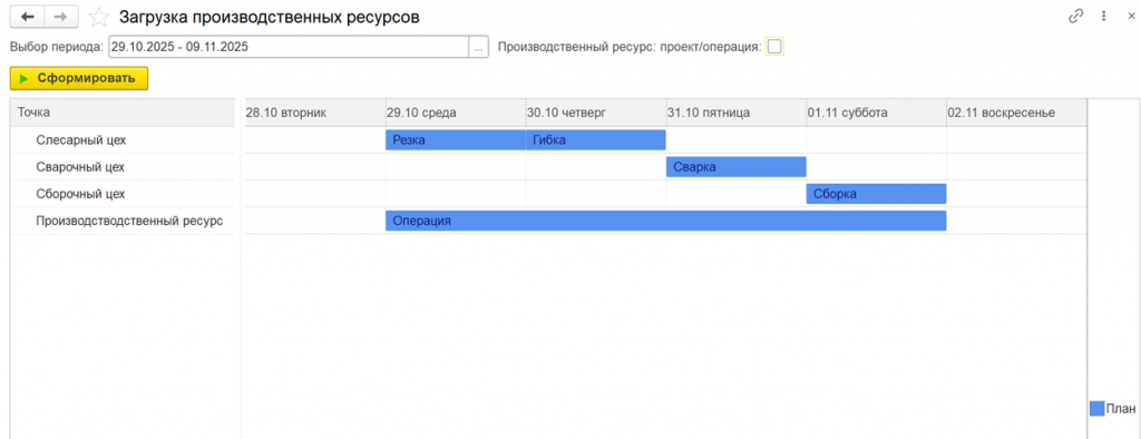 3. Распределение на исполнителей. Основная операция снабжается общим ресурсом "Производственный ресурс", в то время как каждая последующая операция привязывается к конкретному участку (например, слесарный участок: резка и гибка; сварочный участок: сварка; сборочный участок: сборка).