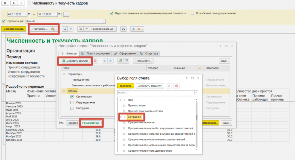 Отчет формируется за конкретный период. После этого предполагается расшифровка показателя «Средняя численность списочного состава» по месяцам (кнопка «Настройки отчета» – вид «Расширенный»).