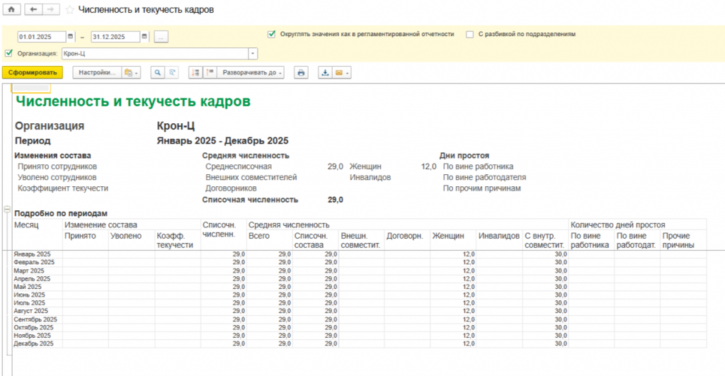 Проверить правильность отображения среднесписочной численности можно через отчет «Численность и текучесть кадров» одним из двух способов.