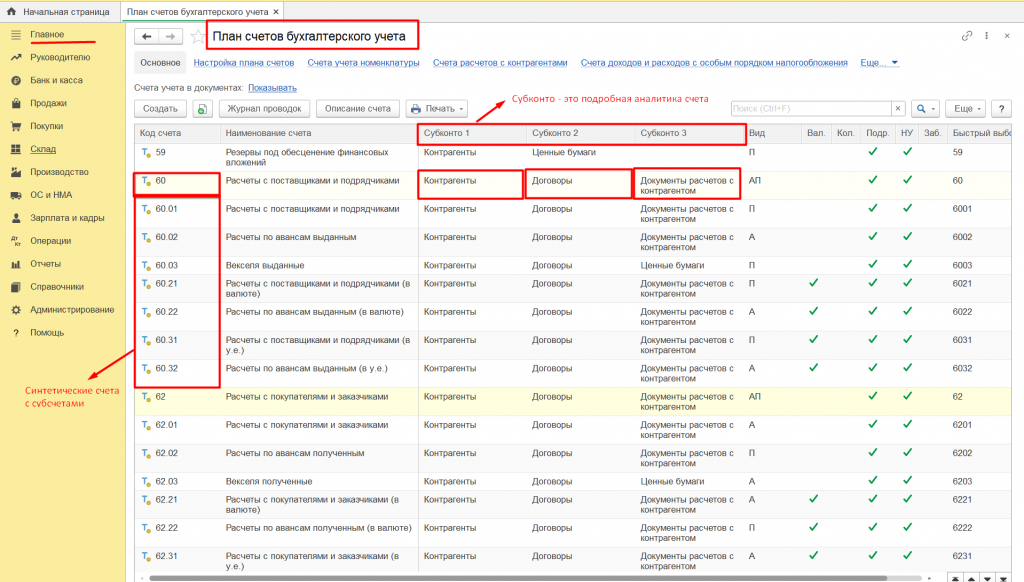 Синтетические счета в конфигурации программы 1С:Бухгалтерия