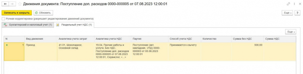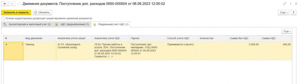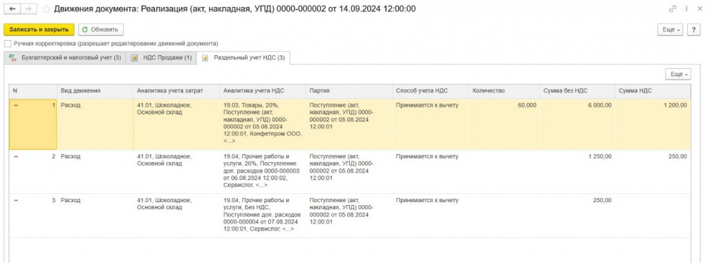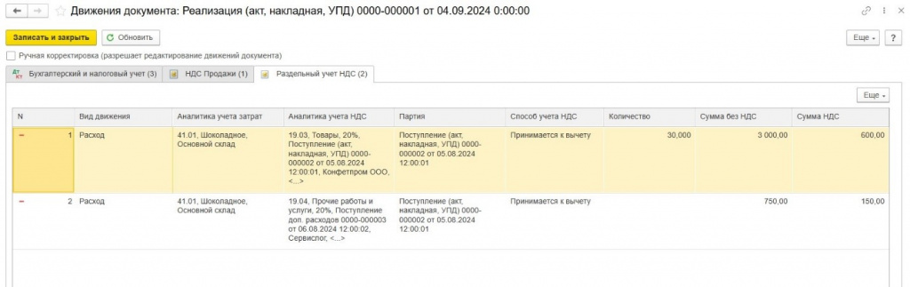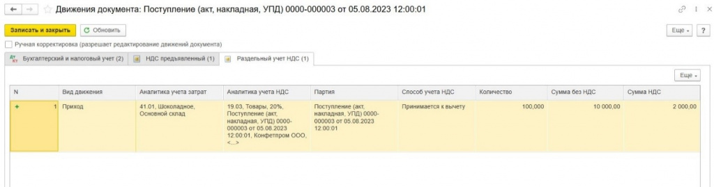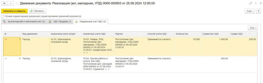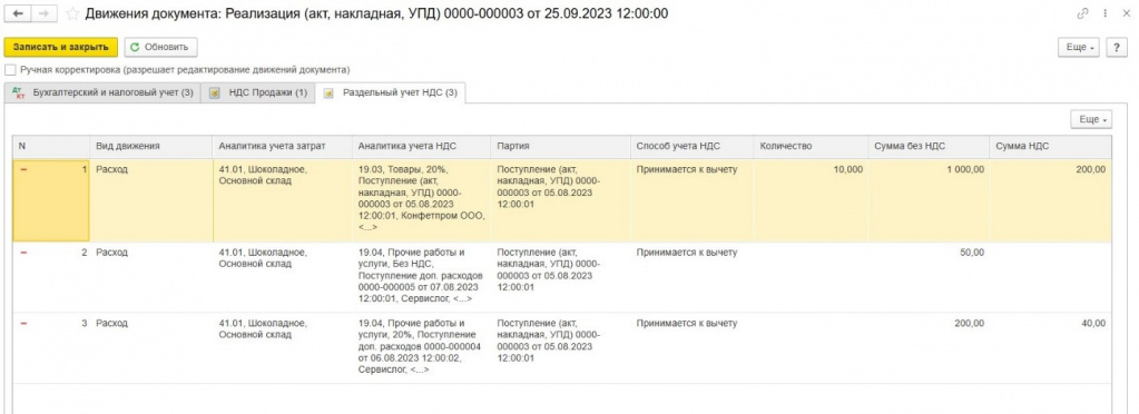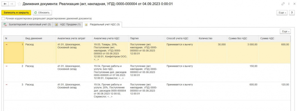 В нашем примере, операции при продаже печенья 04.09.23 г. в регистр «Раздельный учет НДС» будут записаны следующим образом: