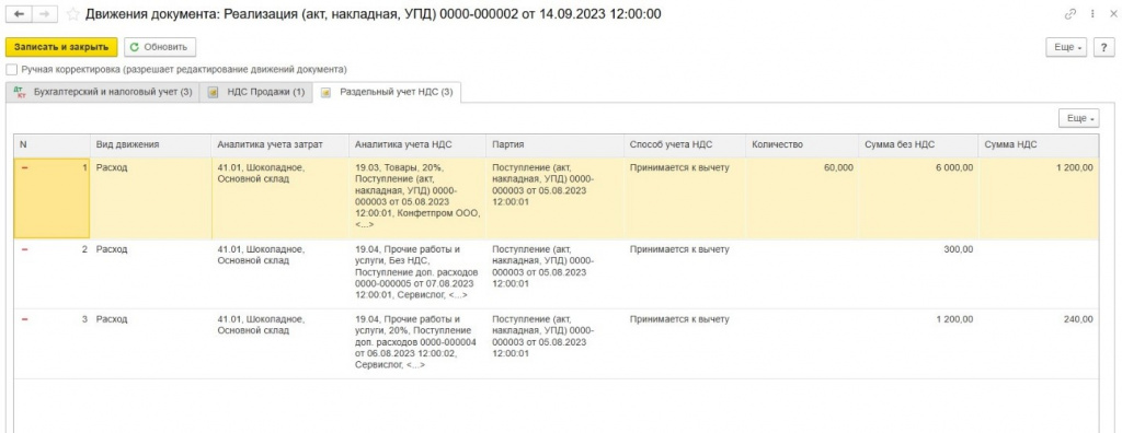 В нашем примере, операции при продаже печенья 04.09.23 г. в регистр «Раздельный учет НДС» будут записаны следующим образом: