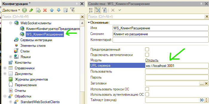 В основную конфигурацию добавил WebSocket-клиент с именем «WS_КлиентРасширение» и удалил расширение: