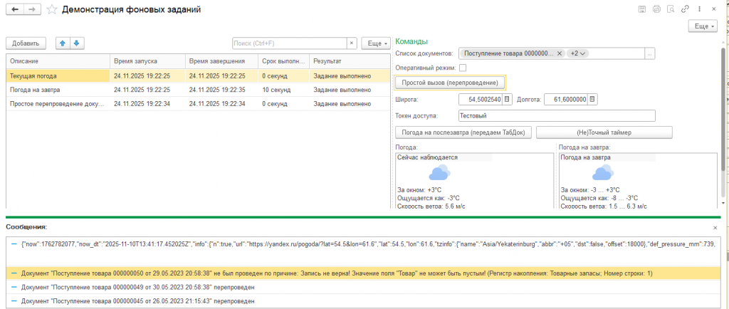 Итак, функцию получения погоды мы подготовили, а теперь первый вызов фонового задания с нашей формы: