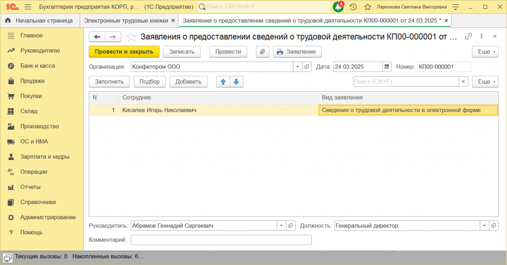 Убедиться, что запись о переходе на ЭТК была внесена правильно, можно проверив карточку сотрудника. Для этого: