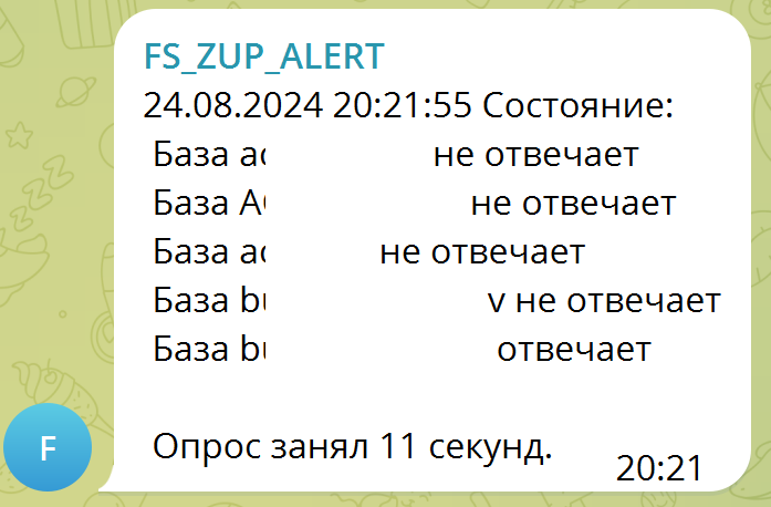 Кроме того, внедрили мониторинг доступности баз. Каждые 5 минут система отправляет запрос и, если что-то не так, сразу сигнализирует в Telegram.