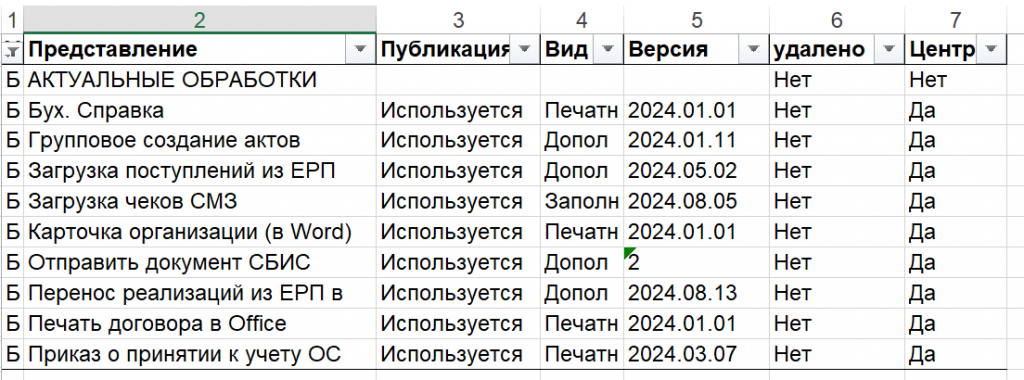 Чтобы разобраться с этим, в каждом расширении, каждой печатной форме и каждой внешней обработке мы стали указывать номер версии — не типовой «1-2-3-4», а дату в формате «год, месяц, день». Благодаря этому в сводном отчёте сразу видно: где обновление прошло, где всё в порядке, а где дата отличается — значит, что-то забыли обновить или остались экспериментальные данные.