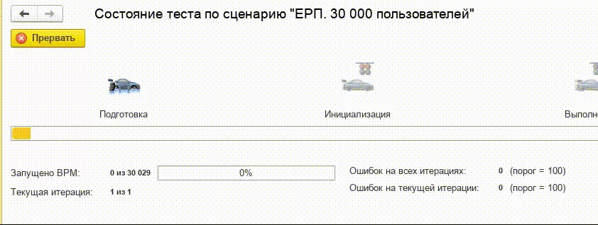Поэтому настоятельно рекомендуем: для проведения НТ с большим количеством пользователей 1С заранее заполните справочник «Пользователи» и рассчитайте права доступа. Это избавит систему от лишней нагрузки во время самого теста и обеспечит точность результатов. На картинке – ускоренный в 50 раз процесс запуска 30 000 ВРМ:
