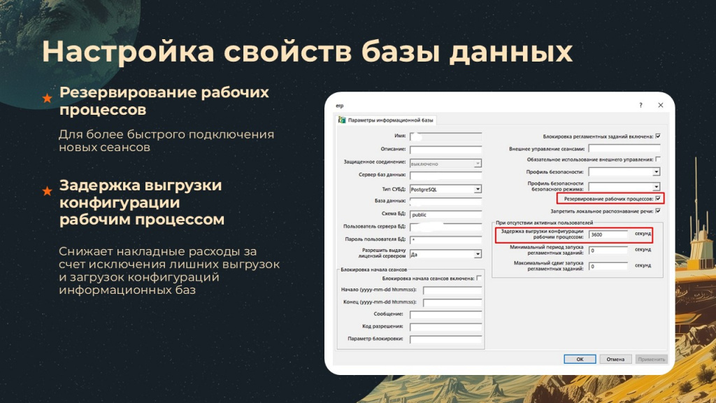 Еще одно полезное свойство, которое снижает накладные расходы на серверы приложений – это задержка выгрузки конфигурации рабочим процессом. Этот параметр определяет время, через которое данные информационной базы будут выгружены из памяти рабочего процесса, когда количество активных соединений в этом рабочем процессе станет равным нулю.