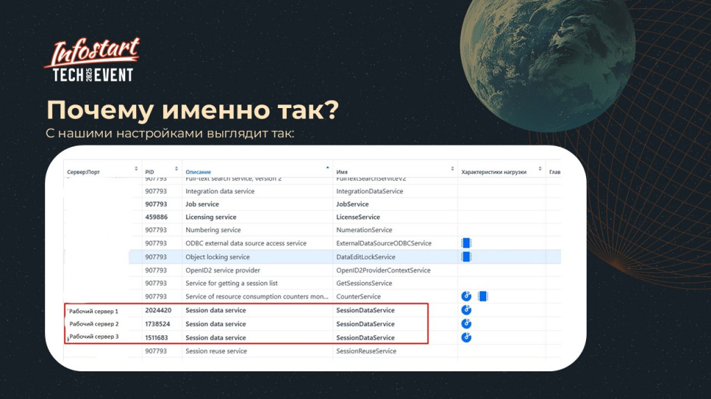 • разрешить размещение сервисам сеансовых данных на рабочих серверах Это позволило добиться оптимального распределения нагрузки в кластере 1С