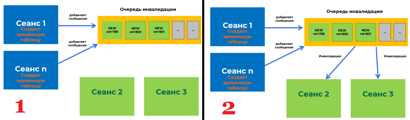 Но так как временная таблица существует только в рамках сеанса, который ее создал, и другим сеансам она не нужна, то здесь решение довольно простое: не отправлять в очередь инвалидации сообщения связанные с временными таблицами.