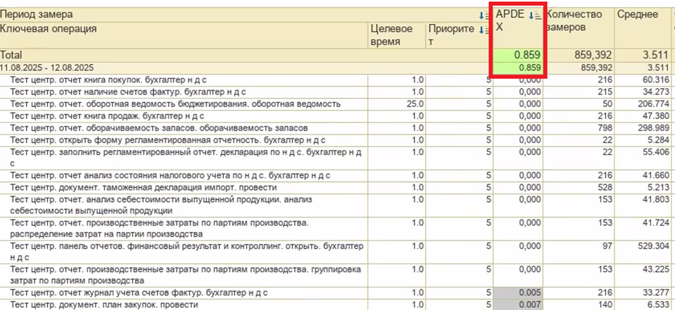Общий APDEX по всем ключевым операциям (APDEX — стандарт для измерения производительности приложений)