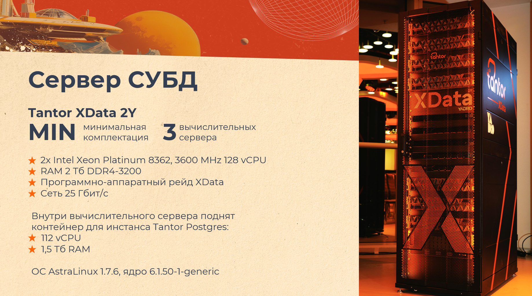 Но не только тюнинг настроек и доработка Tantor Postgres помогли нам достигнуть такого результата. Огромною роль играло и само оборудование, на котором работал сервер СУБД. В его качестве был наш собственный ПАК Tantor XData 2Y в минимальной комплектации, в которую входило 3 вычислительных сервера с характеристиками как на слайде: