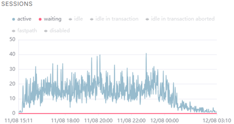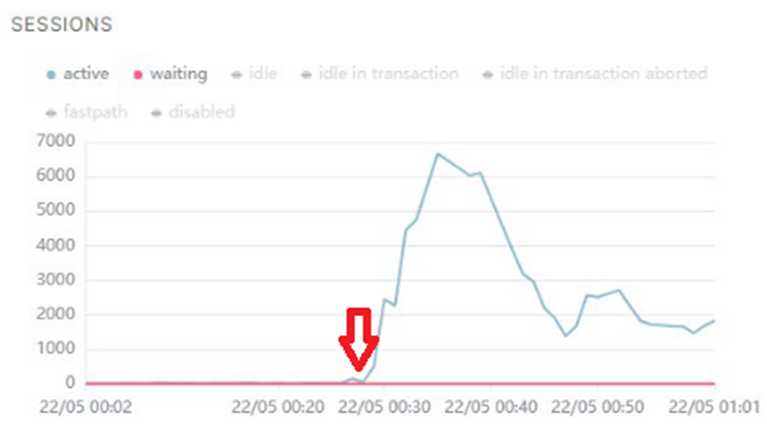 Сначала мы видим что у нас около тысячи соединений большая часть из которых в режиме ожидания команды (idle), и немного активных. Но вдруг количество активных начинает резко расти, как вы видели на графике выше с количеством сессий.